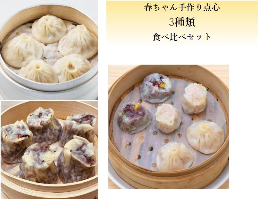 3種類の味わいを楽しめる「三種蒸し点心食べ比べ」。モチモチとした食感が特徴の黒米もちの焼売、ぷりぷりのエビがたっぷり詰まったエビの焼売、そしてジューシーな肉汁が魅力の小籠包の三品が一度に味わえ、ちょっとしたおやつやディナーのおともにぴったりです!